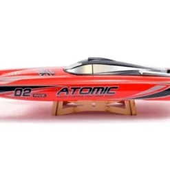 Coming pre-assembled and finished in two striking colour schemes, the Atomic, with it’s ABS moulded unibody hull features a 2.4ghz radio system, 40Amp brushless speed control and water cooled brushless outrunner mo-tor all installed at the factory. All you have to do is charge the Lipo battery, add AA’s to your transmitter and you are all set for the water.
